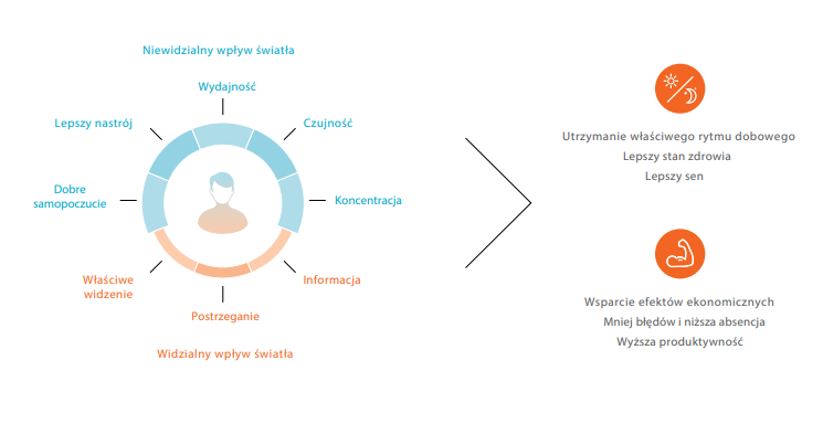 Oświetlenie zgodne z ideą HCL naśladuje zmienne parametry naturalnego światła i dostosowuje je do rytmu dobowego człowieka. Zaawansowane systemy sterowania synchronizują widmo światła opraw z widmem światła słonecznego i pozwalają dostosować parametry świecenia do aktualnych potrzeb użytkowników. A wszystko za pomocą prostej w obsłudze, mobilnej aplikacji.